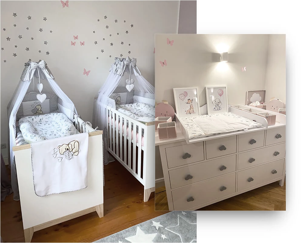 Wir freuen uns dir einen Einblick in Anna-Marias Babyzimmer geben zu dürfen. In dem behaglichen Zimmer findest du unseren praktischen Wickelaufsatz "Noah“ mit zusätzlicher Ablage für alle benötigten Babyutensilien. Passend dazu hat sich Anna-Maria unsere Wickelauflage "Flora“ in zarten Mint- und Grüntönen ausgesucht. Die Mädchen brauchen viel Platz. Dazu eignen sich unsere massiven Kleiderschränke "Carlotta“ mit viel Staufläche im schicken skandinavischen Hausdesign bieten. Einen sicheren und heimeligen Ort zum Schlafen finden die drei Mädels in unseren "Ida“ Babybetten. Ergänzend hierzu schafft das aus reiner OEKO-TEX Baumwolle produzierte Babynest "Flora“ mit tollen Funktionen, wie abnehmbarer Bettschlange und komfortabler Matratze, zusätzliche Geborgenheit. Damit die besten Kleidungsstücke der kleinen Prinzessinnen ihren passenden Auftritt bekommen, hat Anna-Maria unsere süße Kleiderstange "Svetjé“ mit Herz-Ausschnitt zauberhaft dekoriert.