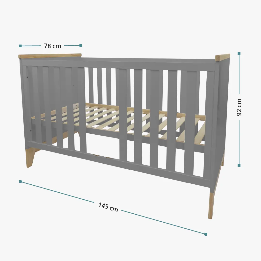 Das Babybett Ida ist ein hochwertig verarbeitetes Gitterbett aus MDF- und Kiefernholz. Durch die Kombination aus grau lackiertem und naturbelassenem Kiefernholz lässt sich das Bett gut mit verschiedenen Kinderzimmereinrichtungen kombinieren.