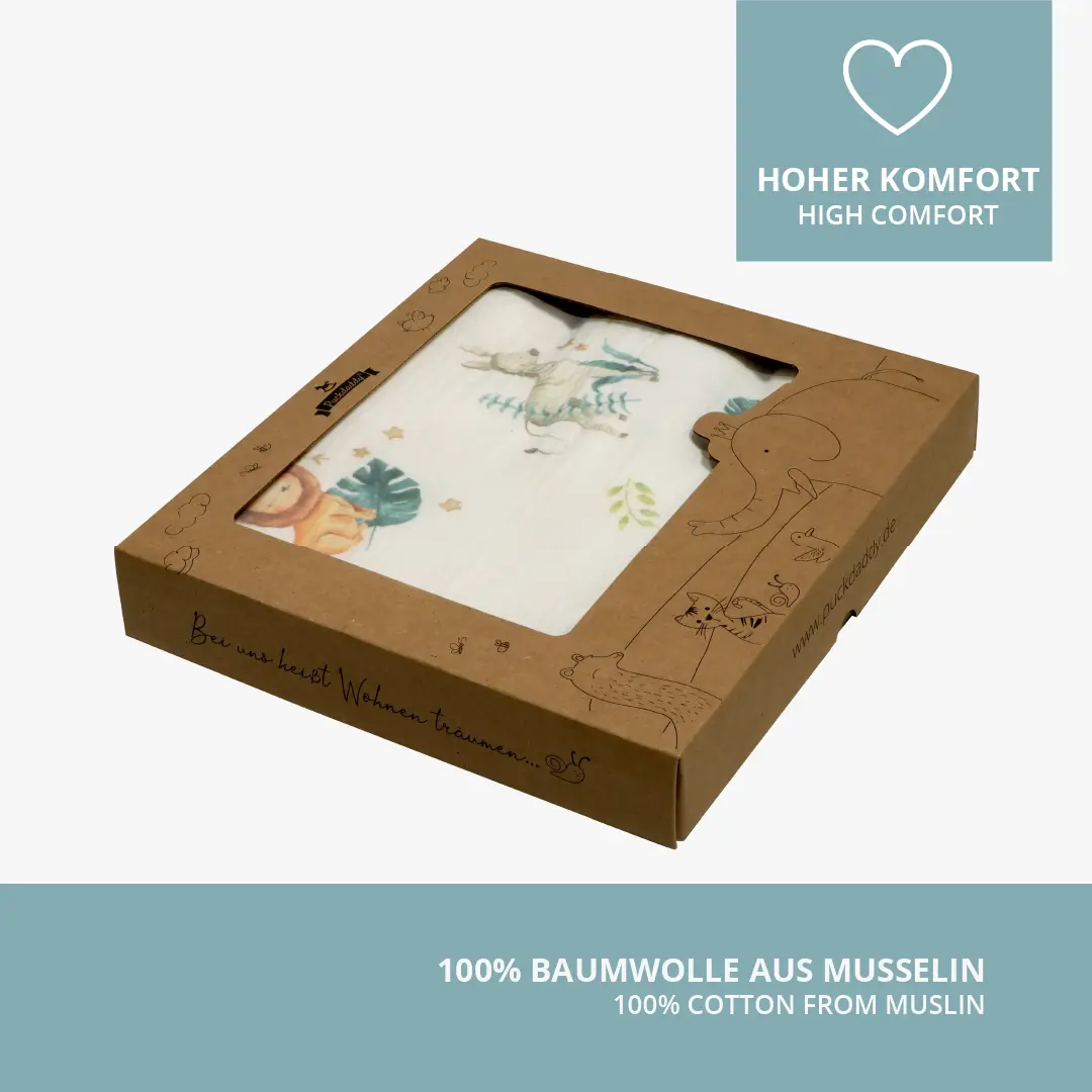 Musselinstoff ist atmungsaktiv, verhindert starkes Schwitzen und sorgt für eine optimale Luftzirkulation.