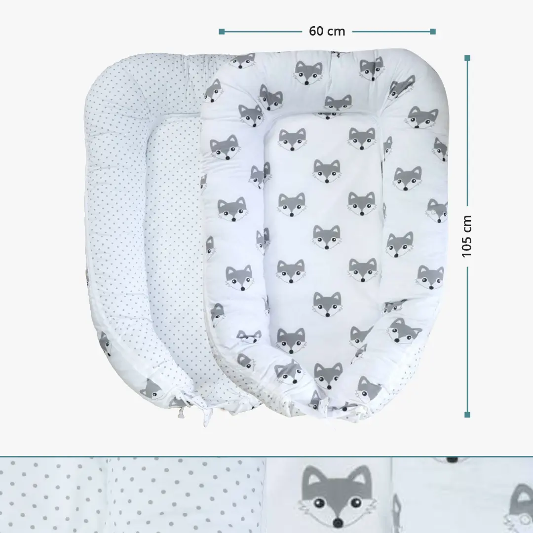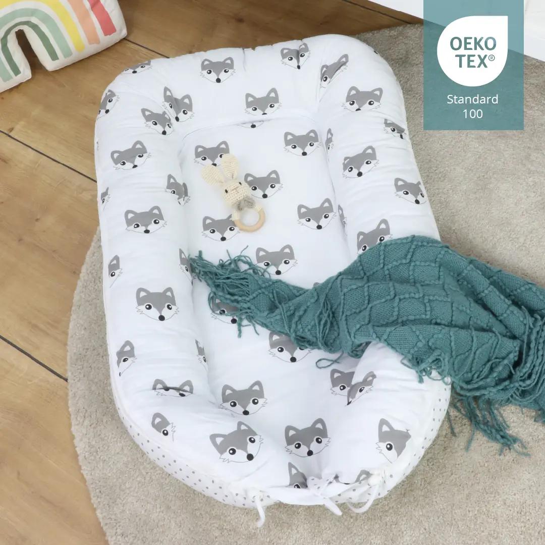 Das Babynest Liv im Wendedesign mit Fuchs-Motiv und Pünktchen ist ein richtiges Multitalent und verfügt über eine Reißverschluss-, Klett- und Zugband-Funktion. Dadurch ist das Babynest noch vielseitiger einsetzbar und einfacher zu pflegen.