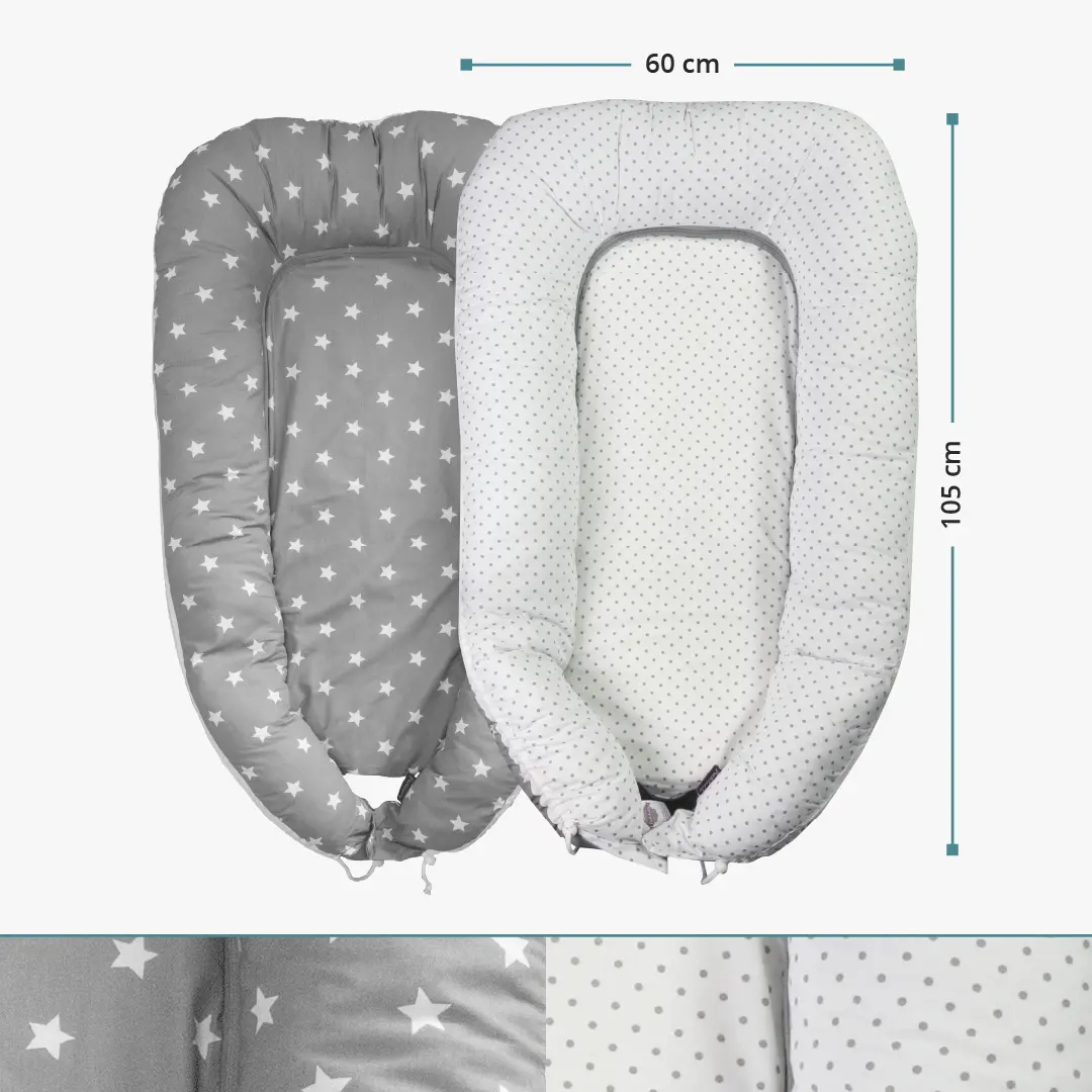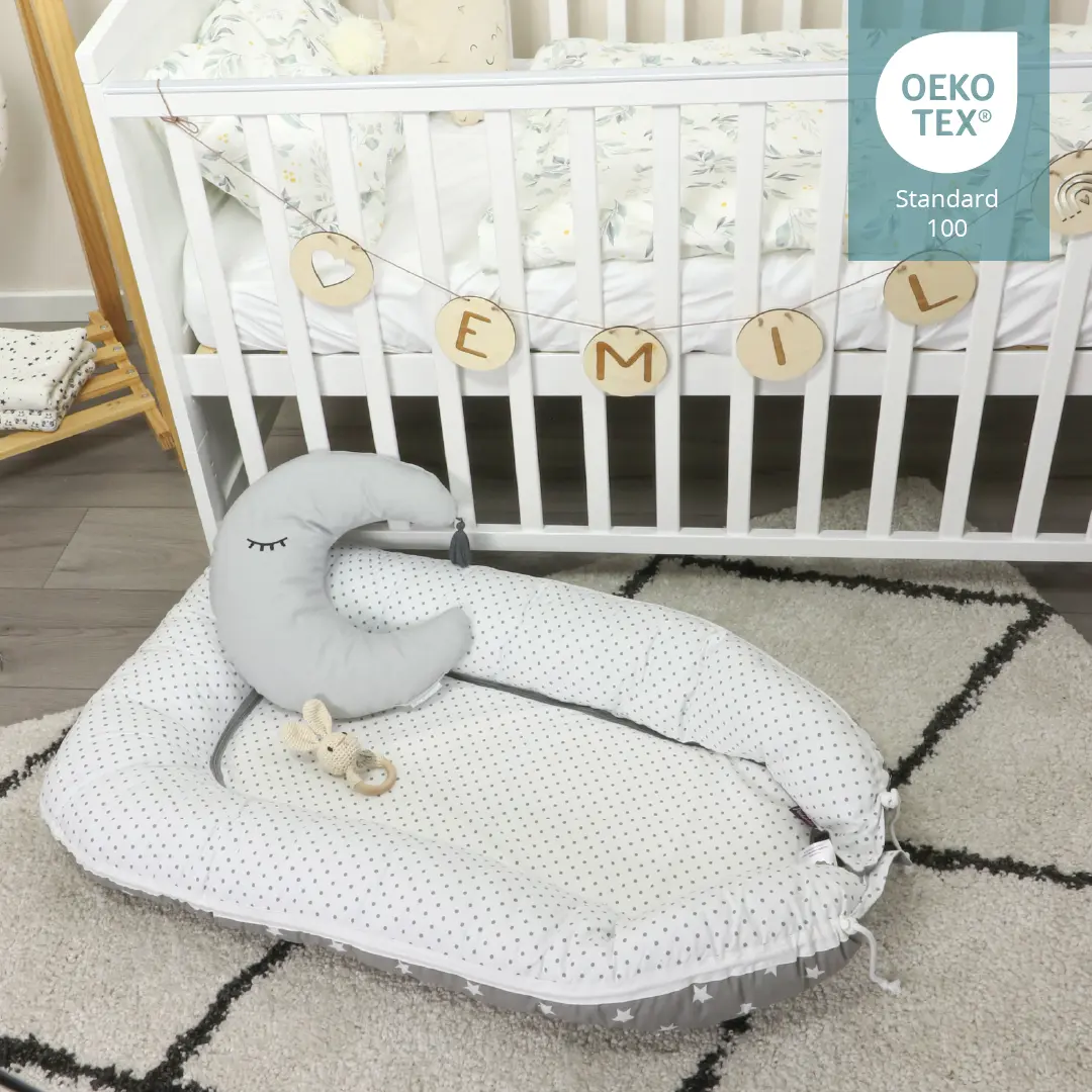 Das Babynest Linnea im Wendedesign mit Sternen und Pünktchen ist ein richtiges Multitalent und verfügt über eine Reißverschluss-, Klett- und Zugband-Funktion. Dadurch ist das Babynest noch vielseitiger einsetzbar und einfacher zu pflegen.
