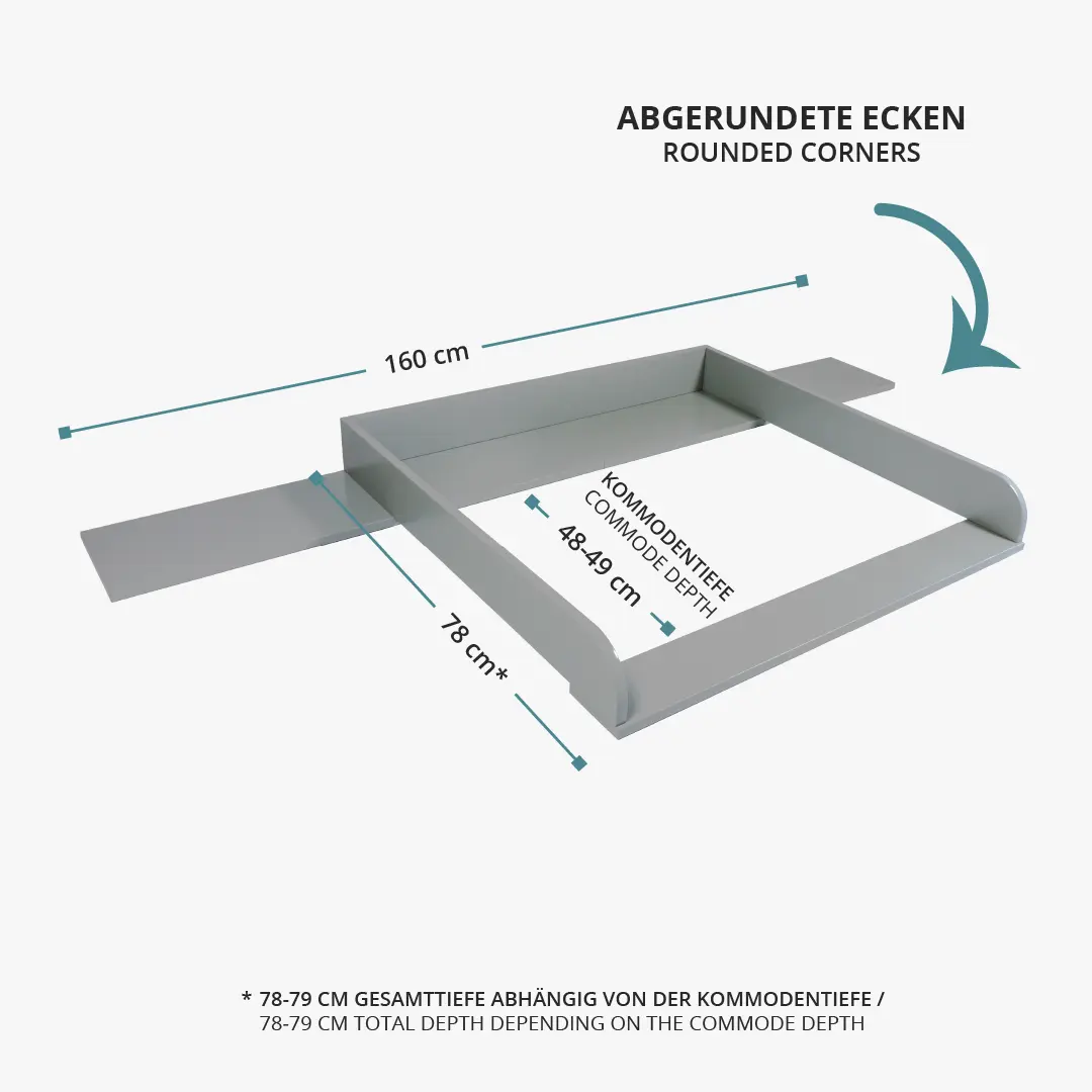 Dank der integrierten Blende schließt der Wickelaufsatz bündig mit der Wand und der Kommode ab und schafft zusätzliche Ablagefläche. Der grau lackierte Wickelaufsatz verfügt über abgerundete Kanten. Mit einer Liegefläche von 77x76 cm bietet der Wickelaufsatz viel Platz beim Wickeln. Der Wickelaufsatz mit Blende lässt sich besonders gut mit unseren Wickelauflagen in der Größe "standard" kombinieren.