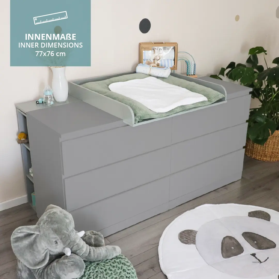 Mit dem Wickelaufsatz Lorenz entsteht ein praktischer und moderner Wickelplatz. Dieser Wickelaufsatz passt auf alle Kommoden mit einer Tiefe von 48-49 cm und einer Mindestbreite von 160 cm, wie die große IKEA Malm Kommode mit 6 Schubladen.