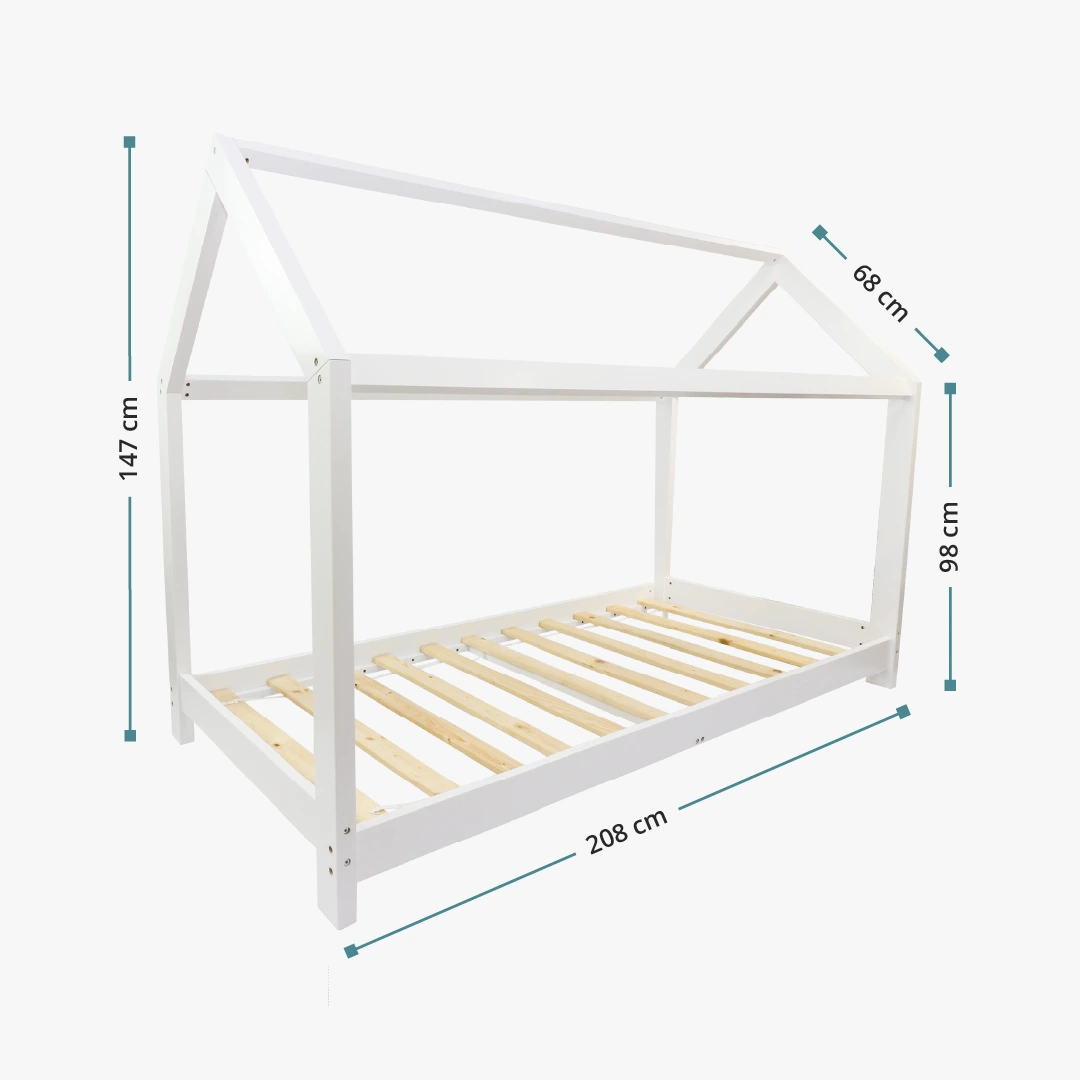 Das Bett ist für alle Kinder und Teenager von 4-16 Jahren geeignet. Die Querbalken und der Giebel des Hausbettes sind so an dem Bett angebracht, dass auch Erwachsene genug Kopffreiheit haben.