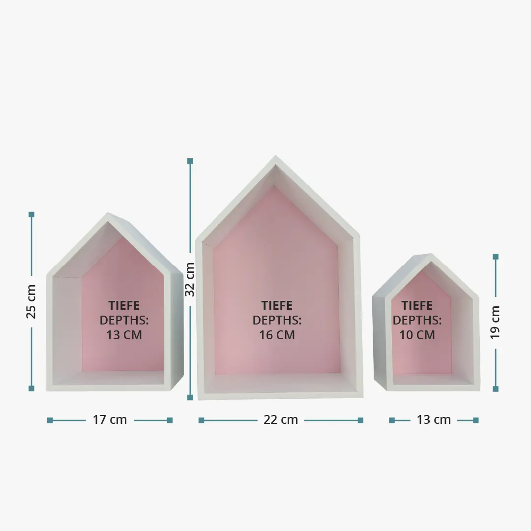 Das Hausregal-Set Elise in rosa besteht aus drei Häusern, die sich einfach und schnell als dekoratives Element an der Wand anbringen oder frei stehend auf die Fensterbank oder Kommode stellen lassen. Mit kleinen Spielzeugen, Stofftieren oder Dekoartikeln bestückt, bieten die Häuser zusätzlichen Stauraum und sind ein Hingucker in jedem Baby- und Kinderzimmer. Das Befestigungsmaterial für die Wand ist nicht im Lieferumfang enthalten.