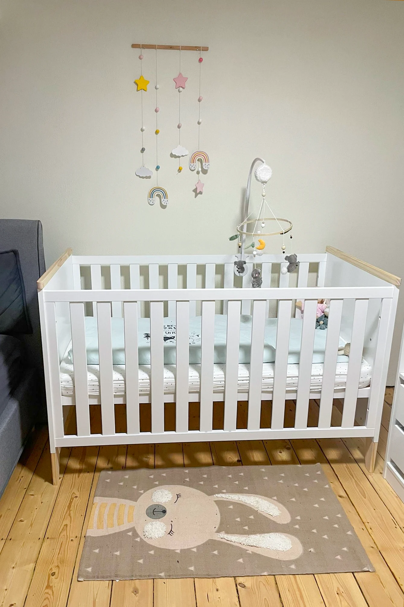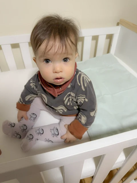 Der Lattenrost ist dreifach höhenverstellbar. Für Lana, die mittlerweile 8 Monate alt ist, haben wir die mittlere Position gewählt – hoch genug, damit sie nicht hinauskrabbeln kann, und niedrig genug, um ihre ersten Versuche zum Hochziehen sicher zu meistern.