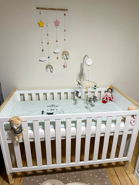 Später lassen sich die Gitterstäbe teilweise entfernen, sodass Lana das Bett eigenständig verlassen kann. Diese Funktion ist genial, da das Bett so lange genutzt werden kann, bis sie schließlich ein größeres Bett benötigt.