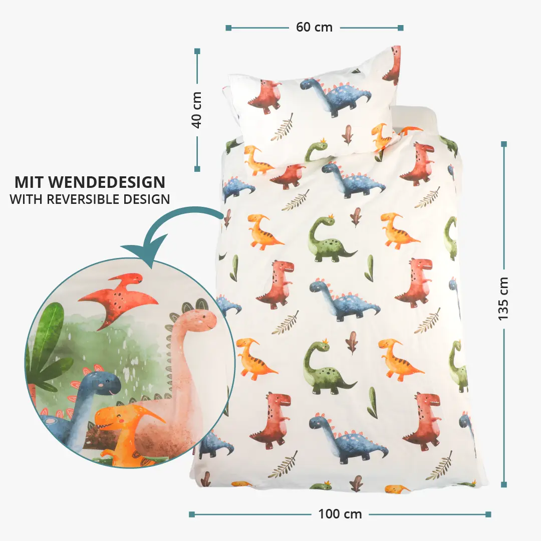 Das weiche Kinderbettwäsche-Set Tekla mit Dino-Motiv verfügt über einen Stoffeinschlag an der Decke und am Kissen für den einfachen Gebrauch. Der Bezug bleibt auch bei aktiven Schläfern an Ort und Stelle. Das Bett-Set hat die Maße 100x135 cm und der Kissenbezug 60x40 cm.