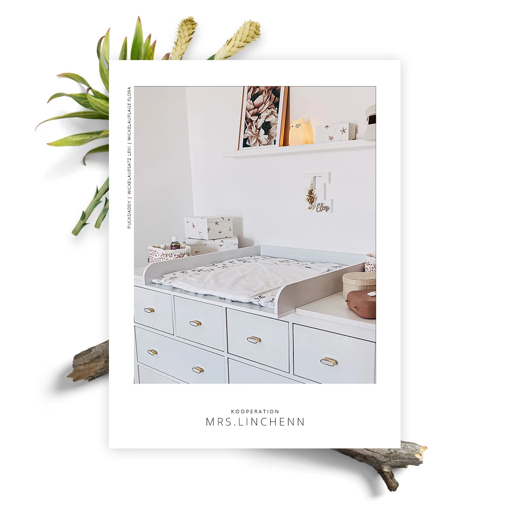 unseren Produkten unterstützen. Der Wickelaufsatz "Levi" hat im hinteren Bereich eine Blende und bietet somit eine zusätzliche Ablagefläche für alle Dinge, die Lina für ihren kleinen Schatz benötigt. Passend zum Kinderzimmer hat sie sich die Wickelauflage "Flora" im floralen Design ausgesucht. Diese hat einen abnehmbaren und waschbaren Frotteebezug. Die Stauraumregale "Lasse" bieten zusätzlichen Stauraum hinter der Kommode. Wir wünschen Lina für ihre Familie alles Liebe.
