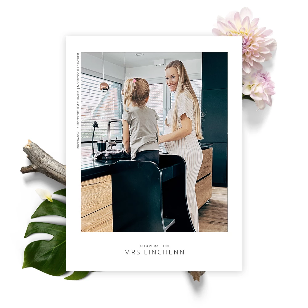 Der Puckdaddy "Entdeckerturm" findet in Linas Küche den richtigen Platz, so dass selbst ihr kleinster Schatz bei der Zubereitung leckerer Speisen helfen kann. Lina hat sich für unseren schwarz lackierten "Entdeckerturm" entschieden, der aus hochwertigem MDF-Holz besteht.