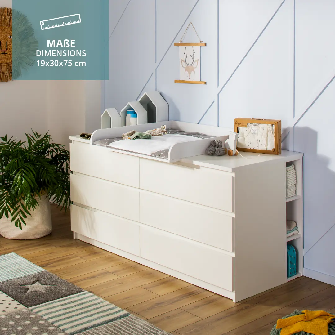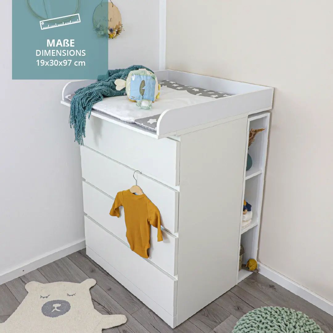 Mit unseren Stauraumregalen kannst du mehr Platz schaffen und gleichzeitig die Einrichtung aufwerten. Die Regale lassen sich perfekt hinter vielen Ikea-Kommoden einfügen und schließen so die Lücke zwischen Kommode und Wand. Hier findest du Platz für Windeln, Pflegeprodukte und alles, was du in Reichweite haben möchtest. So bleibt das Zimmer ordentlich, und du behältst jederzeit den Überblick. Diese Regale sind funktional und gleichzeitig ein optischer Hingucker – ein praktischer Alleskönner, der für Ordnung sorgt.