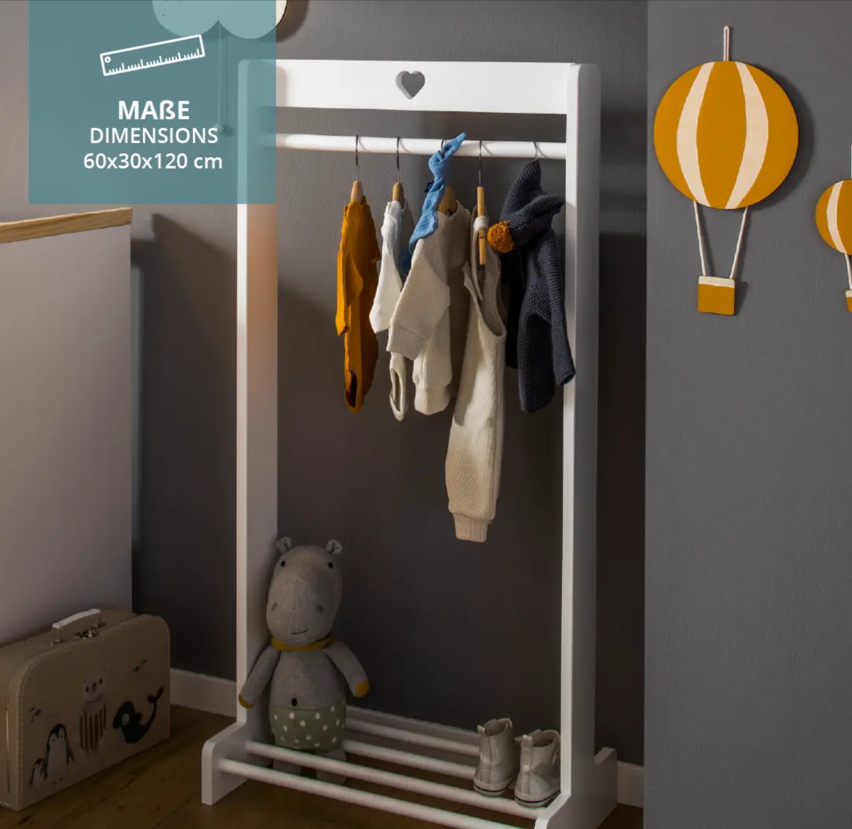 Unsere Kleiderstangen Hugo und Svetje bieten dir eine einfache Möglichkeit, Kinderkleidung übersichtlich zu organisieren und jederzeit griffbereit zu haben. Dank der angenehmen Höhe können auch schon kleine Kinder selbstständig ihre Sachen aufhängen. So bleibt alles ordentlich und griffbereit – ob im Garderobenbereich oder in der Nähe des Wickeltisches.