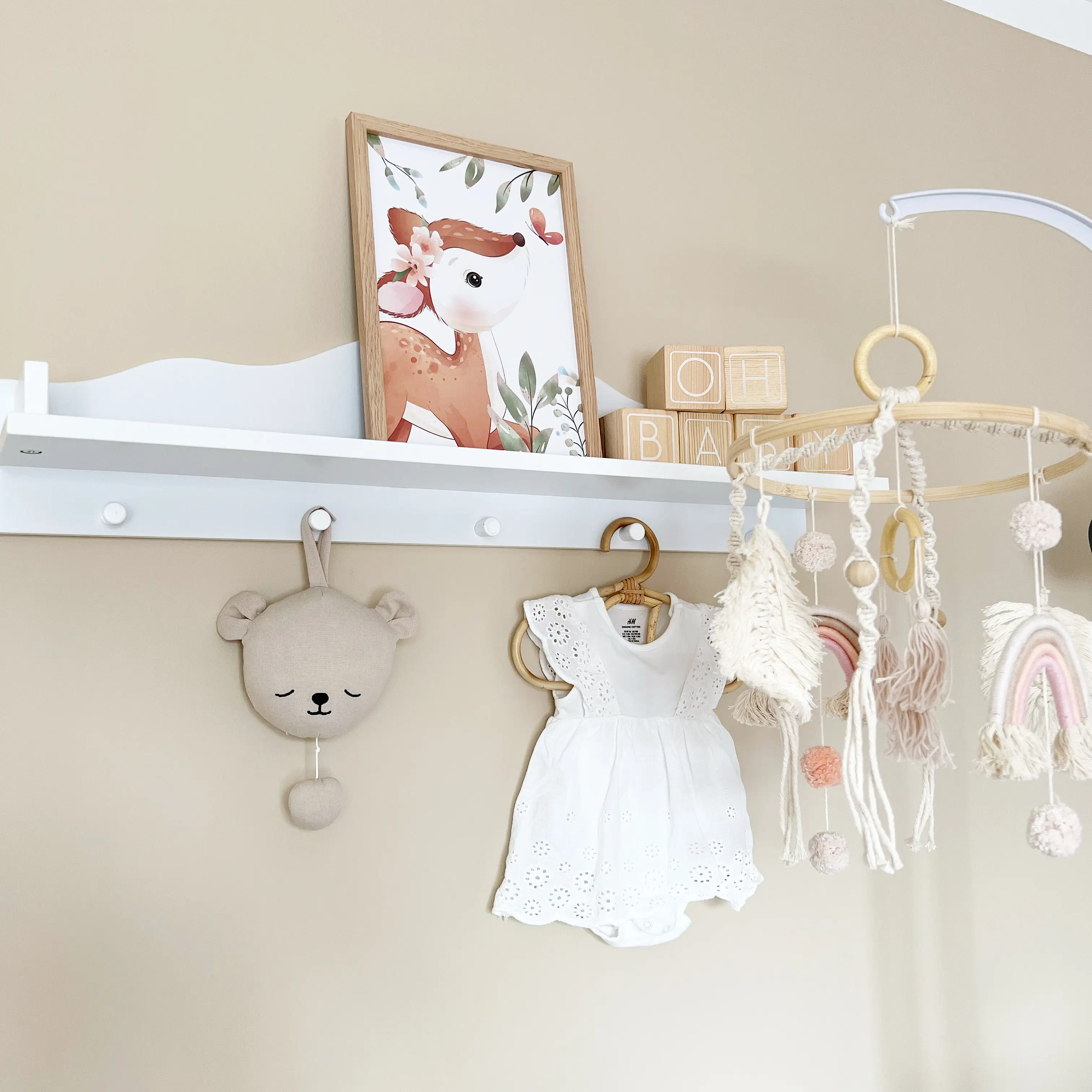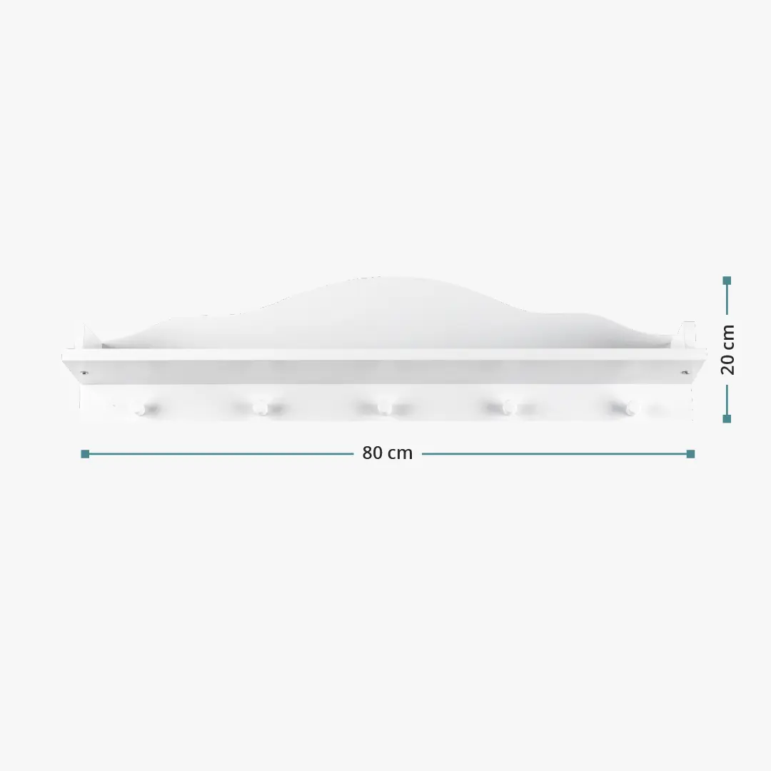 Das weiß lackierte Wandregal Frederik mit geschwungener Rückseite ist ein Hingucker in jedem Baby- und Kinderzimmer. Es bietet eine zusätzliche Ablagefläche für Dekoration und kleine Spielzeuge. Zudem verfügt das Regal über 5 Kleiderhaken, welche sich ideal für das Aufhängen von Kinderkleidung eignen. Frederik lässt sich mit verschiedenen Kinderzimmereinrichtungen, wie auch anderen Artikel mit geschwungenen Elementen kombinieren.