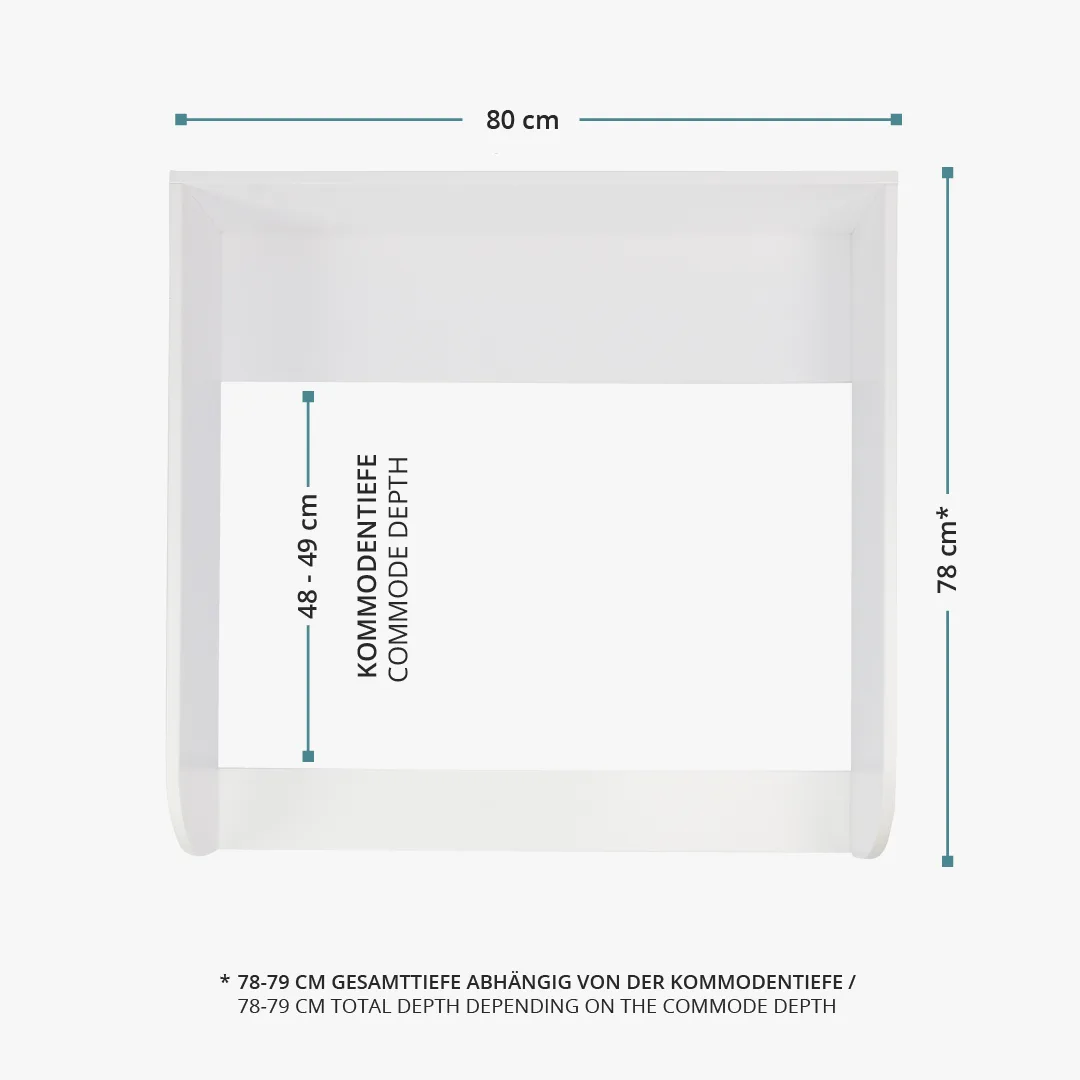 Der weiß lackierte Wickelaufsatz mit abgerundeten Kanten schließt bündig mit der Kommode ab. Mit einer Liegefläche von 77x76 cm bietet der Wickelaufsatz viel Platz beim Wickeln. Die extra hohen Seitenteile mit 15 cm bieten einen zusätzlichen Schutz für sehr aktive Babys.