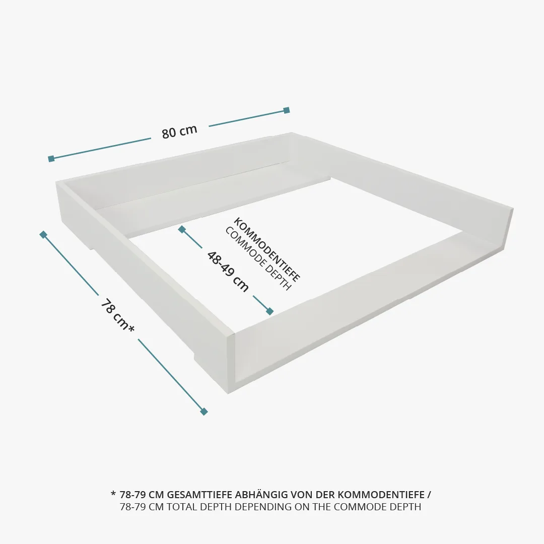 Der weiß lackierte Wickelaufsatz mit geraden Kanten schließt bündig mit der Kommode ab. Mit einer Liegefläche von 77x76 cm bietet der Wickelaufsatz viel Platz beim Wickeln.