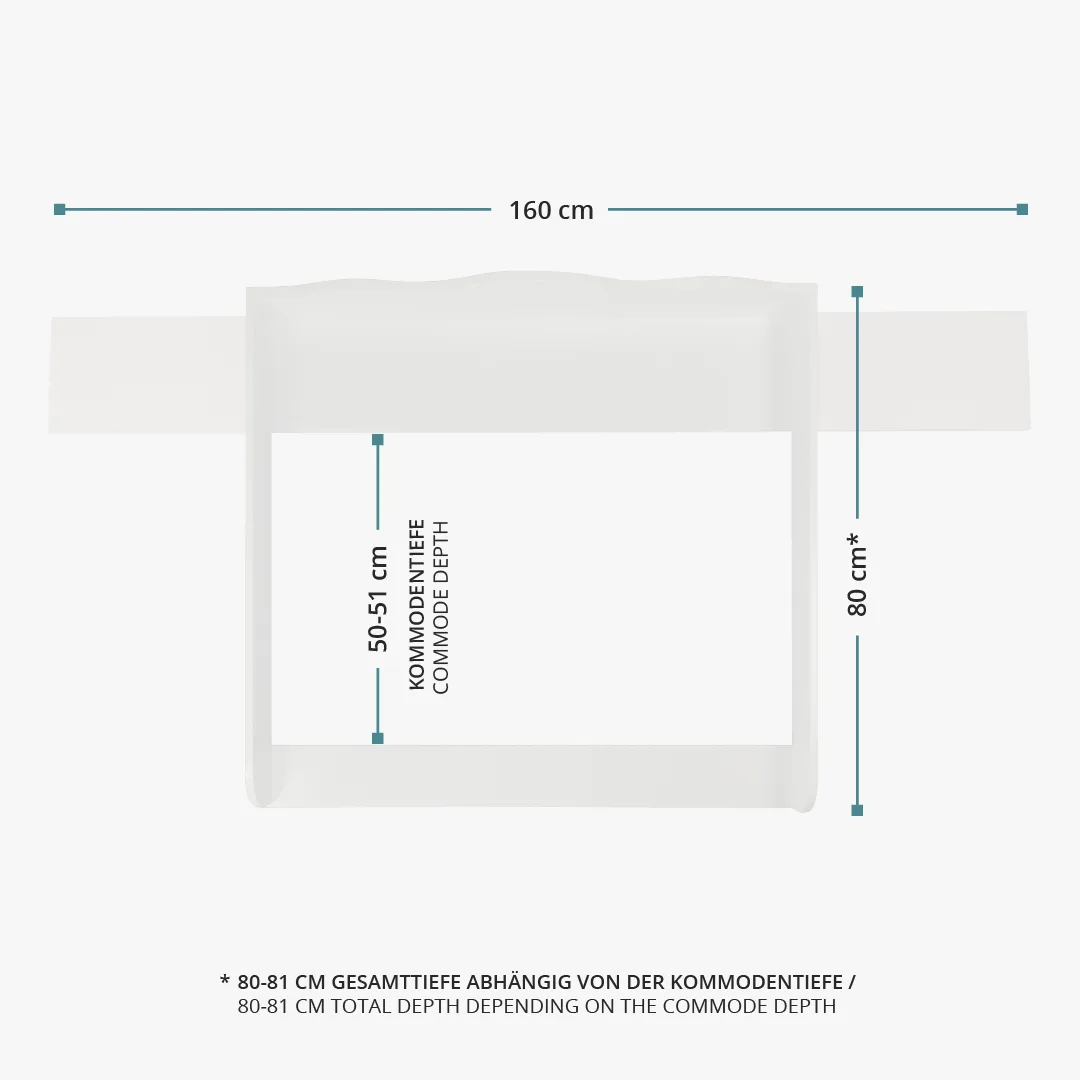 Dank der integrierten Blende schließt der Wickelaufsatz bündig mit der Wand und der Kommode ab und schafft zusätzliche Ablagefläche. Der weiß lackierte Wickelaufsatz mit abgerundeten Kanten verfügt über ein geschwungenes Rückenteil. Mit einer Liegefläche von 77x78 cm bietet der Wickelaufsatz viel Platz beim Wickeln.