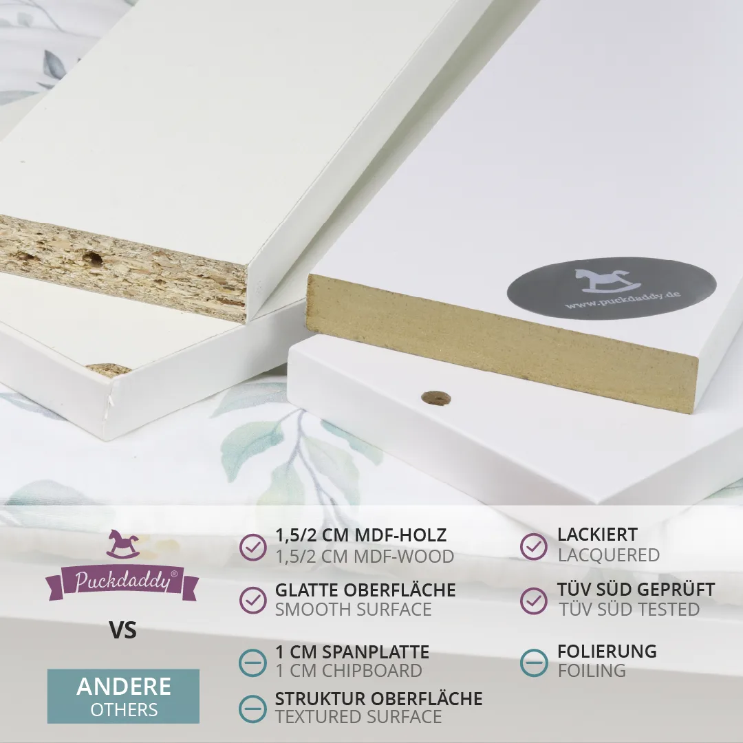 Stabil und stilvoll: Der Wickelaufsatz Emil ist dank der 2 cm Brettstärke noch robuster und hochwertiger.