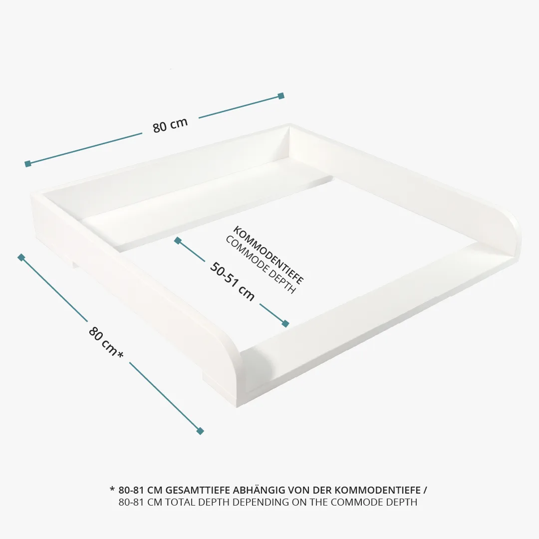 Der weiß lackierte Wickelaufsatz mit abgerundeten Kanten und einer Liegefläche von 77x78 cm bietet viel Platz beim Wickeln.