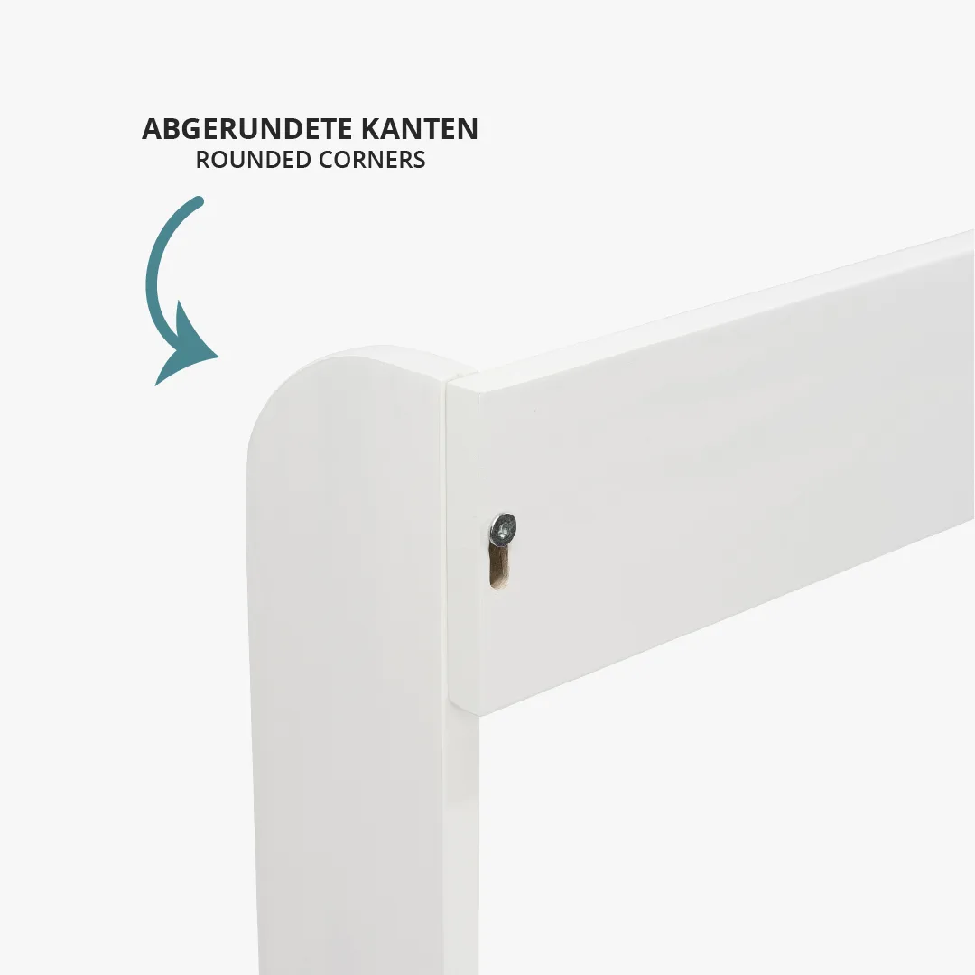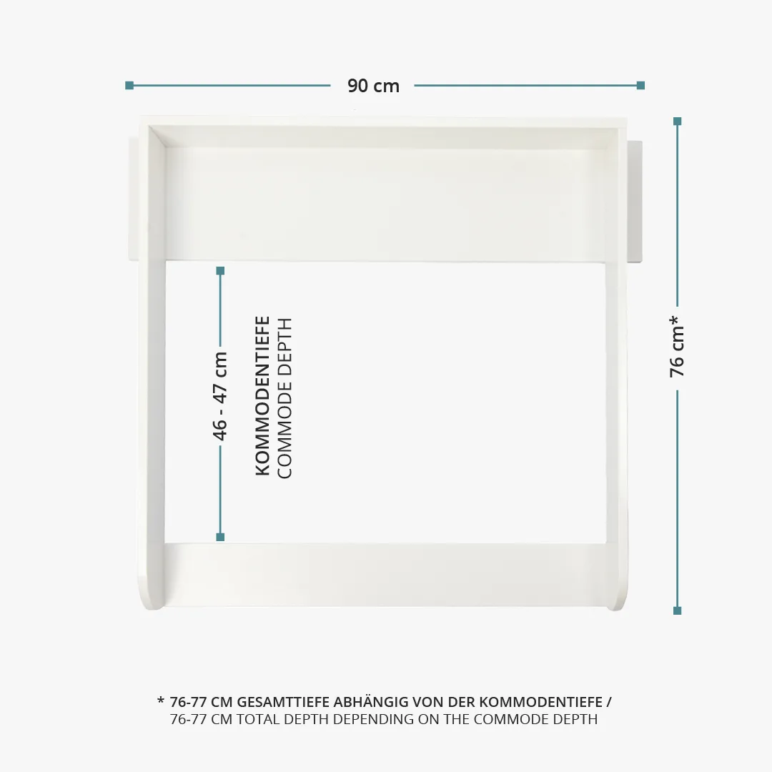 Dank der integrierten Blende schließt der Wickelaufsatz bündig mit der Wand und der Kommode ab und schafft zusätzliche Ablagefläche. Der weiß lackierte Wickelaufsatz verfügt über abgerundete Kanten. Mit einer Liegefläche von 77x74 cm bietet der Wickelaufsatz viel Platz beim Wickeln.