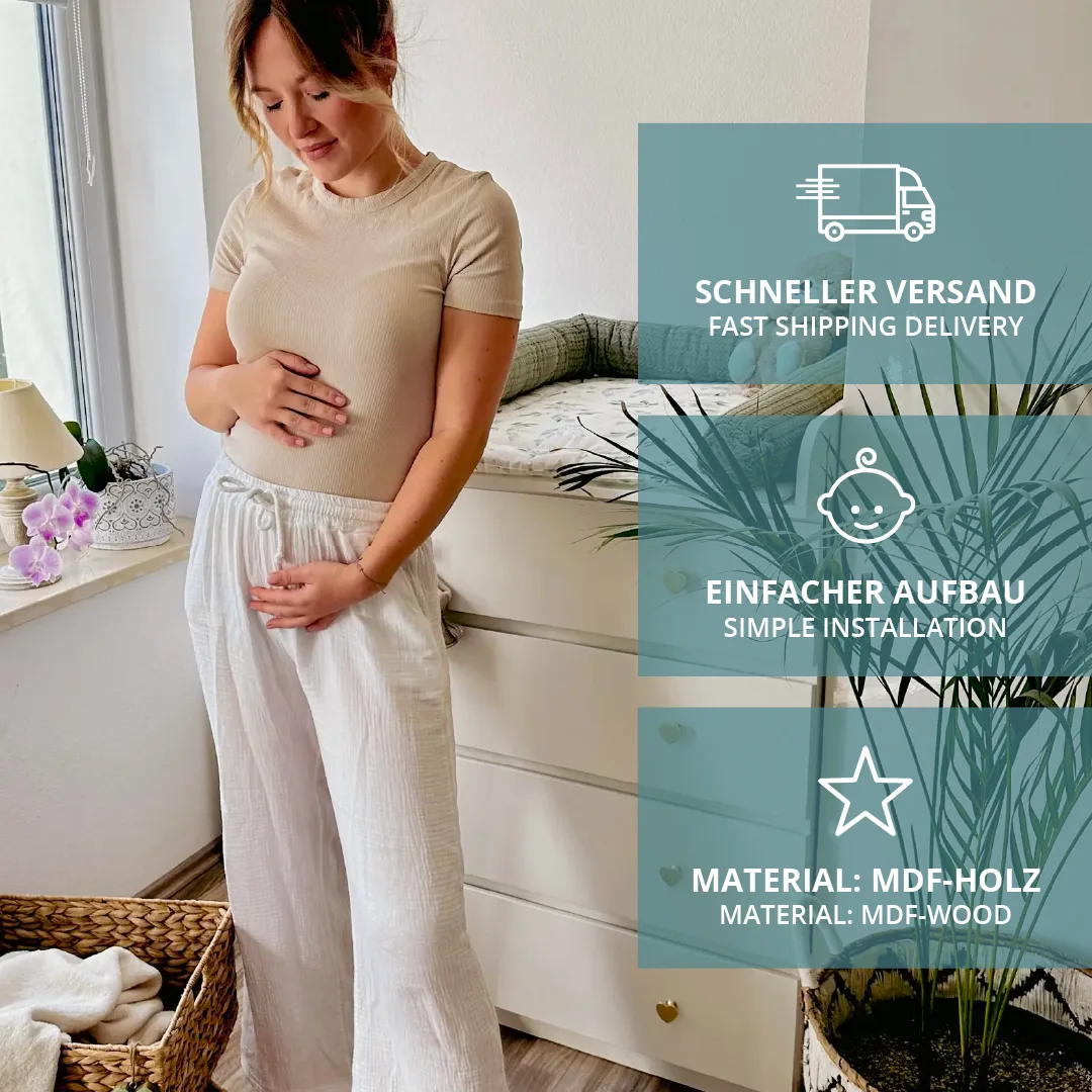 So funktioniert es: Kommode von der Wand vorziehen, Wickelaufsatz auflegen und befestigen. Nach der Wickelzeit kann der Wickelaufsatz wieder abgenommen und die Kommode wie gewohnt weiter verwendet werden, ohne dass die Kommode beschädigt wurde.